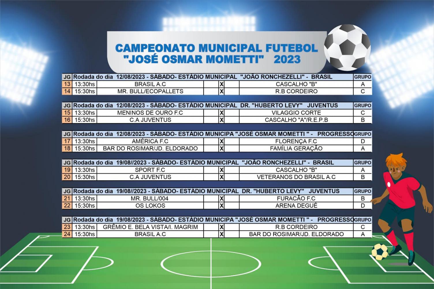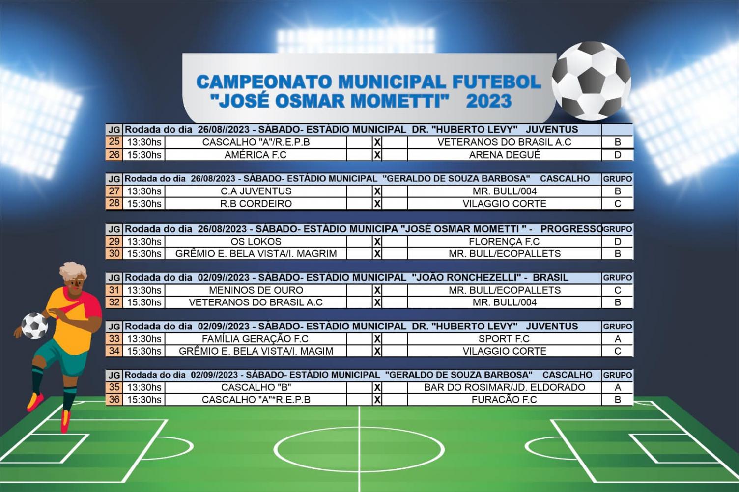 A Secretaria Municipal de Esporte e Lazer, divulgou a programação do Campeonato Municipal de Futebol Varzeano “José Osmar Mometti”. O calendário apresenta uma maratona de dois jogos por campo, que serão promovidos todos os sábados a partir das 13h30min.
