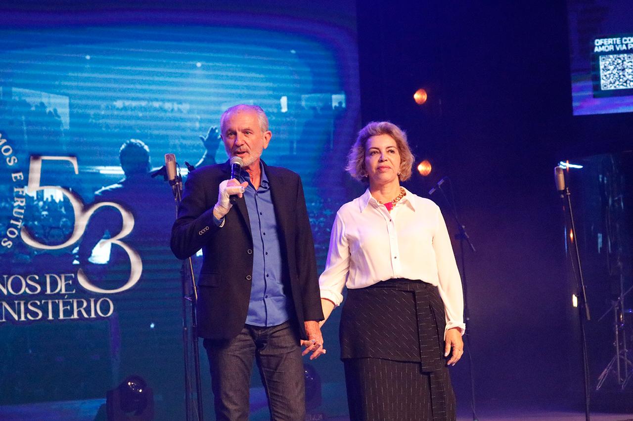 O prefeito Mario Botion e a primeira-dama e presidente do Fundo Social, Roberta Botion, participaram no último domingo (6) de um culto na Igreja do Evangelho Quadrangular, que celebrou os 53 anos de ministério dos pastores Cyro Pereira do Lago e Ozaide Cabral do Lago à frente da denominação religiosa, em