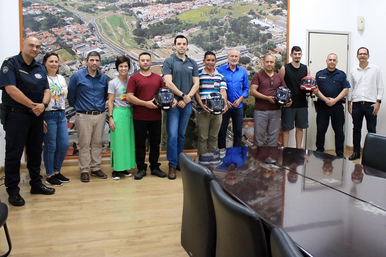 O prefeito Mario Botion e o secretário de Segurança Pública e Defesa Civil, Wagner Marchi, entregaram quatro capacetes a motociclistas que participaram, no mês passado, de uma ação da Prefeitura de