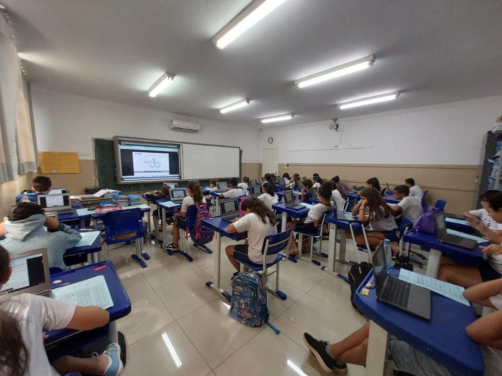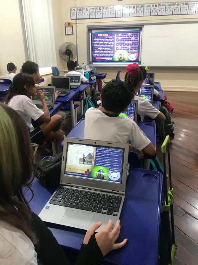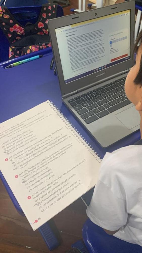 Angelita explica que foi adquirido um material com objetivo de auxiliar os professores no desenvolvimento de habilidades e competências exigidas nas avaliações oficiais do Saeb. “Esse material contém 4 módulos e no final de cada módulo é aplicado um simulado. Os alunos realizaram o simulado no Chromebook onde a correção já é imediata. A cada simulado aplicado, tivemos uma oficina com os coordenadores e os professores, e na oportunidade a formadora ponta os descritores que devemos dar mais atenção”.