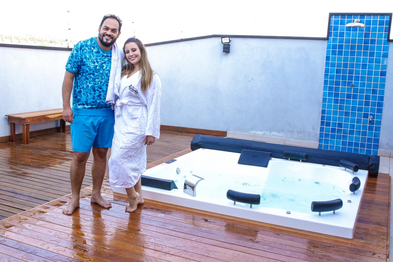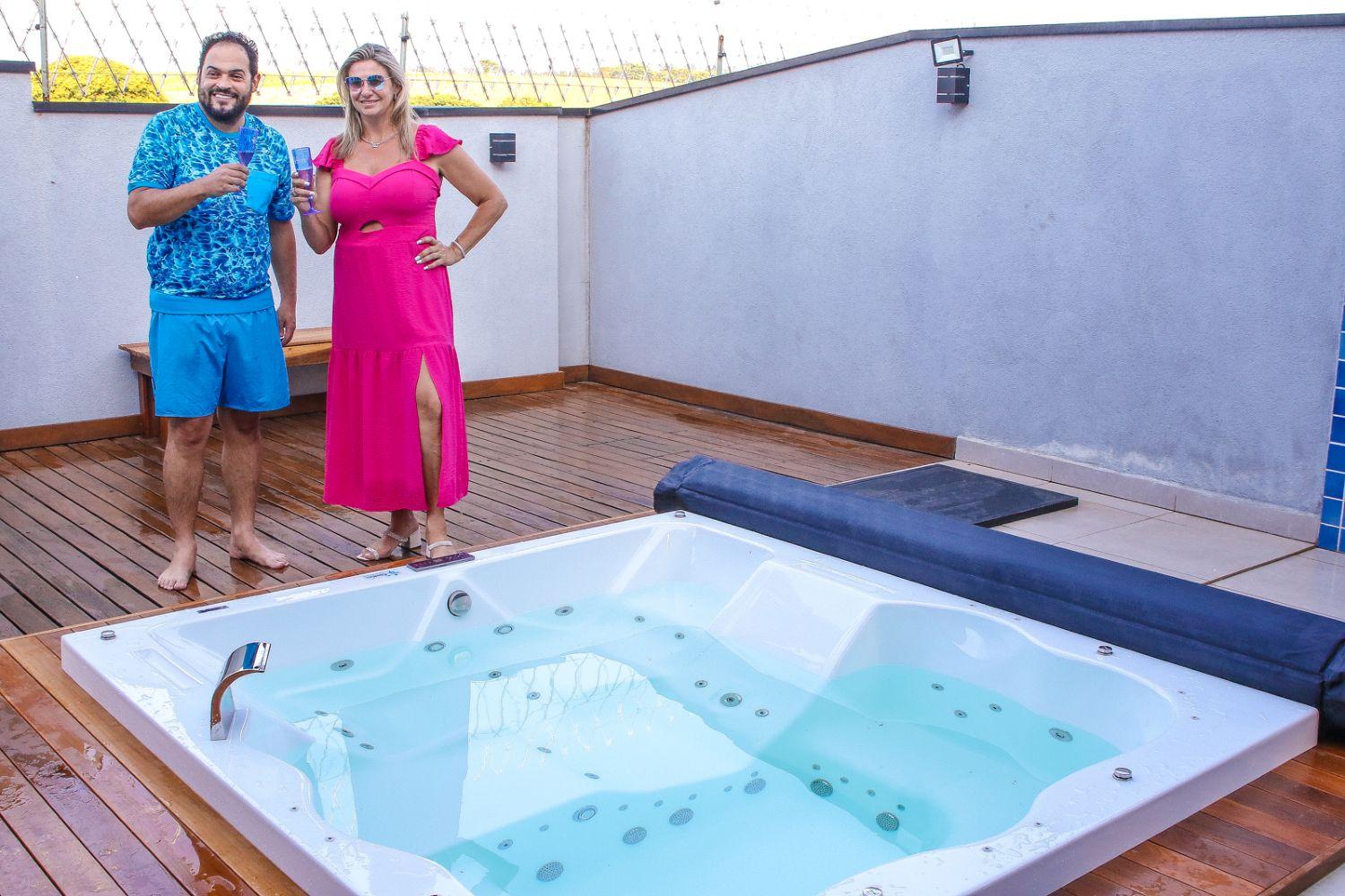 O casal resolveu dar uma bela de uma repaginada na área de lazer de sua residência e para isso optaram em trocar a piscina que possuíam por uma linda banheira de SPA da Aqualax, onde poderão curtir melhor o cantinho a dois em momentos de relax.