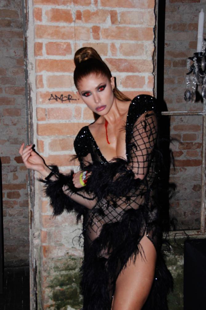 Para abrilhantar a festa e entrar no clima de Halloween, a beldade estava utilizando uma chamativa lente de contato na cor vermelha, e uma make com a simulação de sangue escorrendo pelo pescoço, que a transformou em uma .