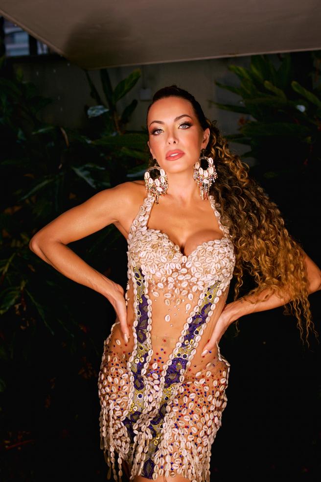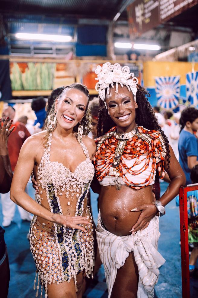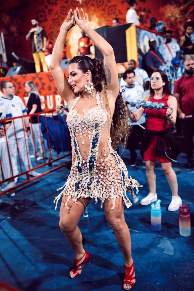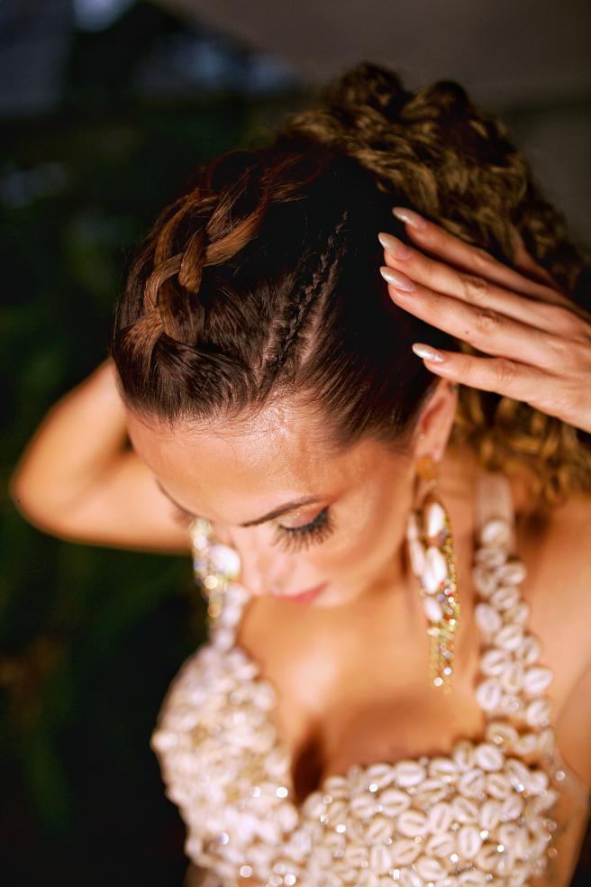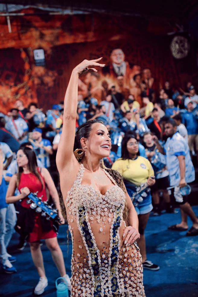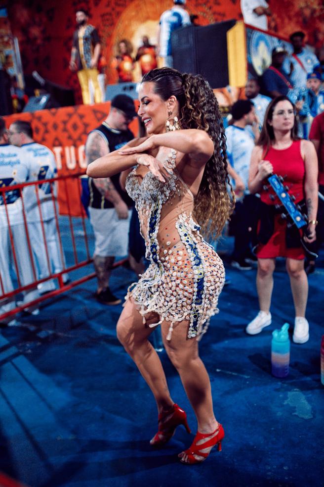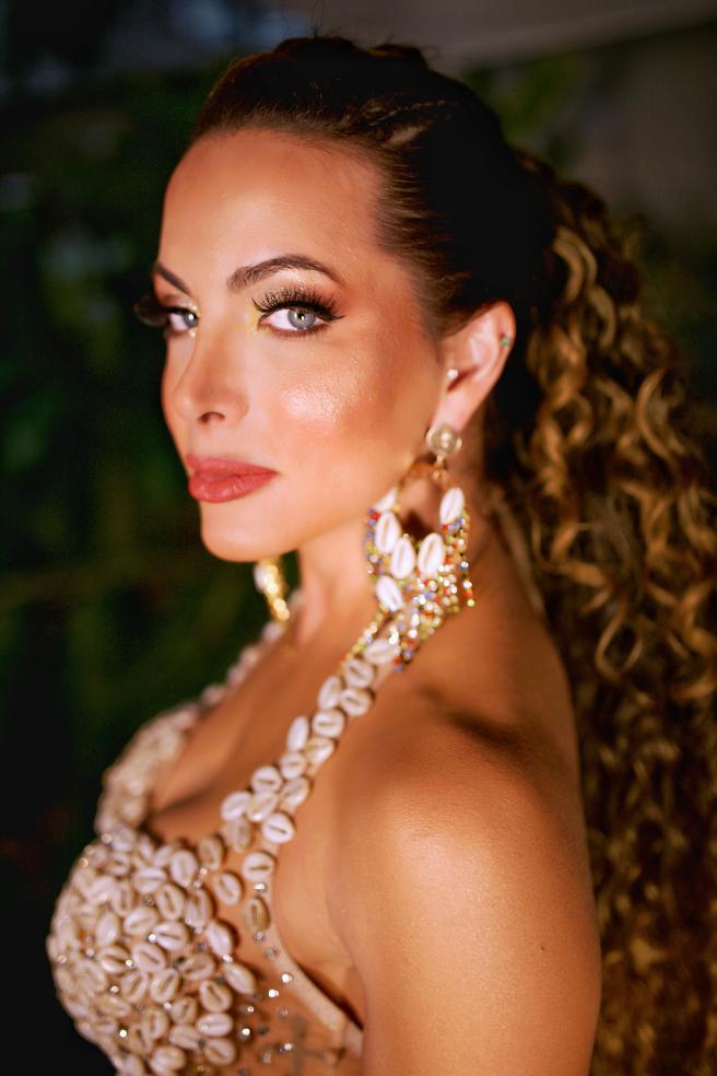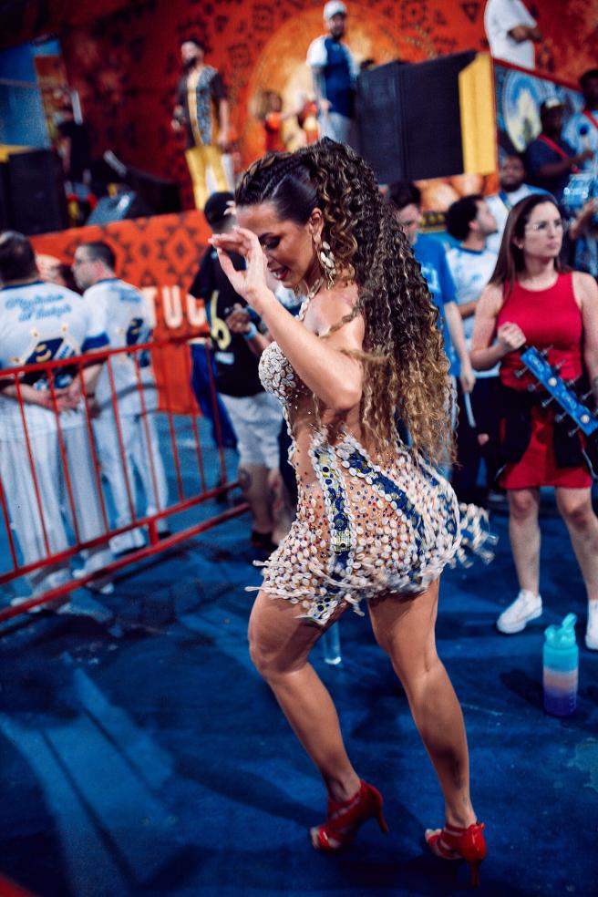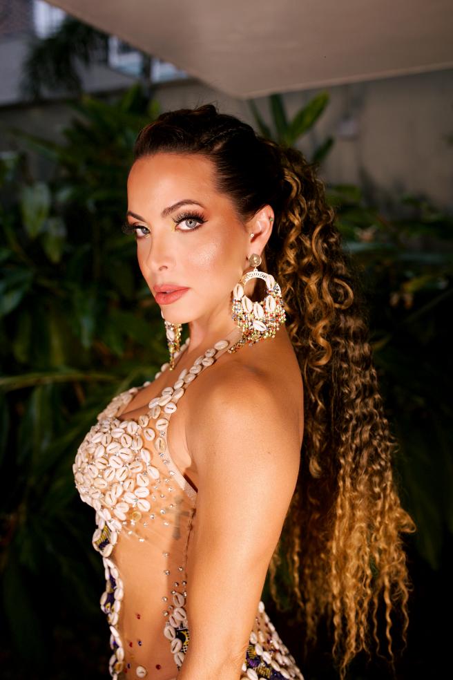 A make e o cabelo foram especiais: Carla escolheu o integrante da agremiação, Wellington Montanha, para fazer toda a produção, que ressaltou ainda mais a beleza natural da apresentadora, não ficando de fora da composição do look uma maravilhosa trança e madeixas enroladas.