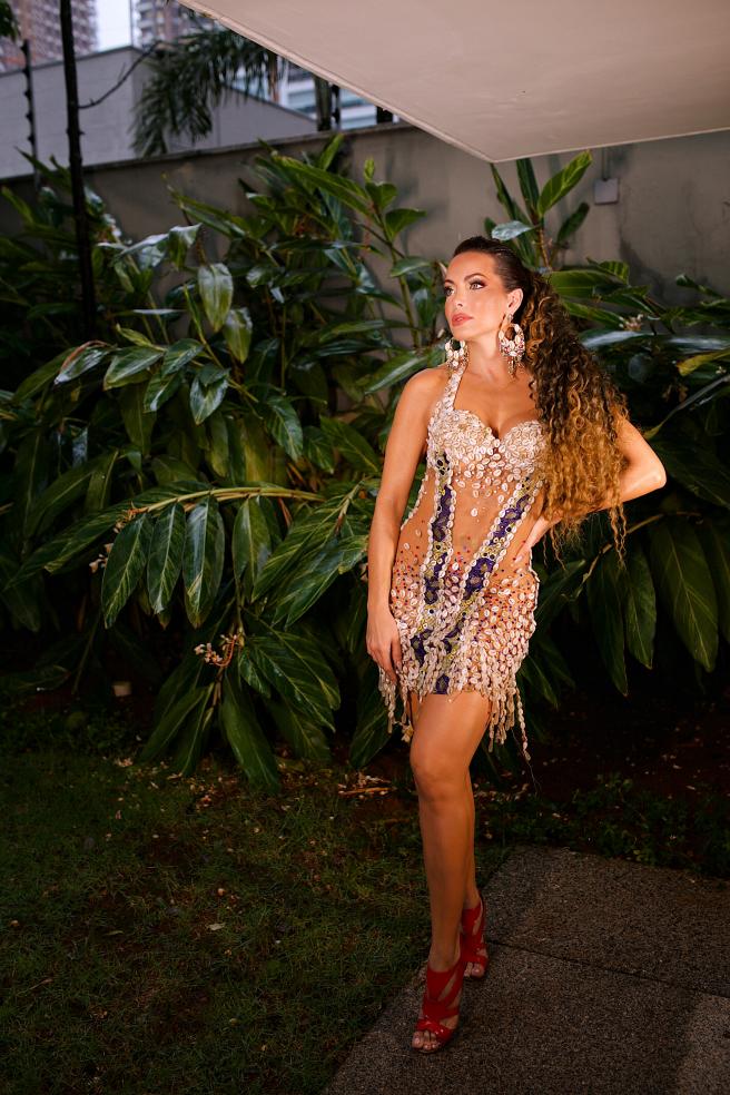 A apresentadora do Pod Trash esbanjou sensualidade com um vestido de decote profundo e bastante transparência, todo trabalhado em búzios e pedrarias vermelha e azul.