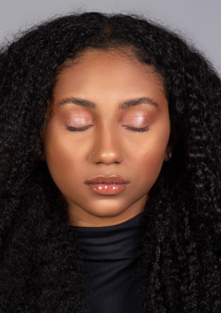 - Para os olhos, use uma sombra neutra de base bem esfumada e uma sombra iluminadora no centro da pálpebra. - Aplique máscara de cílios incolor nas sobrancelhas para segurar os fios no lugar e dar mais volume. Na boca vamos utilizar um gloss transparente com efeito top coat;