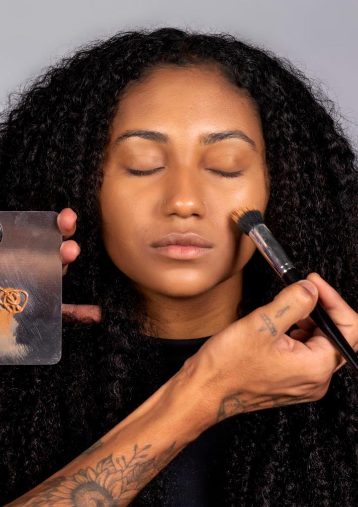 - Misture a base com diluidor de maquiagem para uma cobertura mais leve. Aplique com o pincel kabuki e finalize com a esponja para dar acabamento;