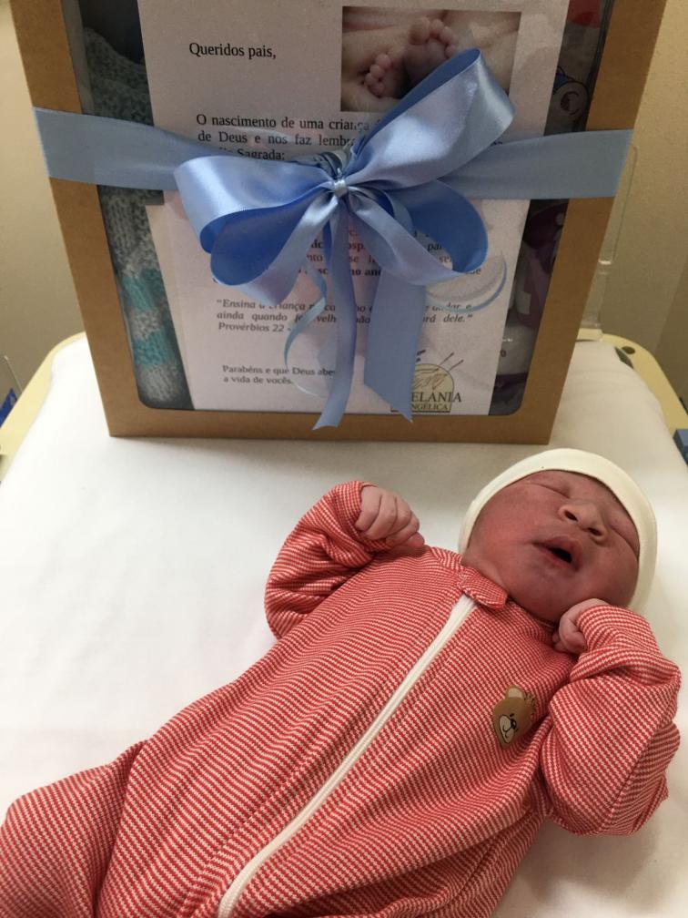 Foi entregue uma lembrança para Heitor preparada pela Capelania Evangélica, que realiza importante trabalho voluntário no hospital há muitos anos. No kit, tem roupinhas e produtos de higiene.