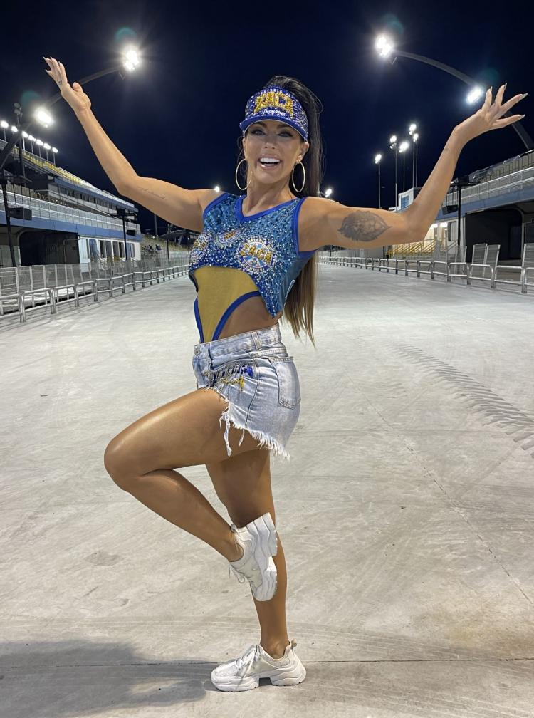 A beldade que vem malhando diariamente na academia para fazer bonito no desfile, já eliminou 09 quilos, e exibiu um corpão sarado, deixando a mostra principalmente as pernas torneadas, enquanto dava um show de simpatia, carisma e muito samba no pé.