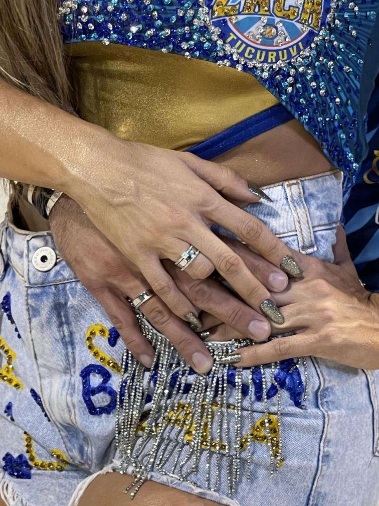 Mas o que realmente chamou muito atenção de todos, foi a larga aliança de noivado que Carla usava enquanto posou para os fotógrafos antes do desfile ao lado do namorado, o