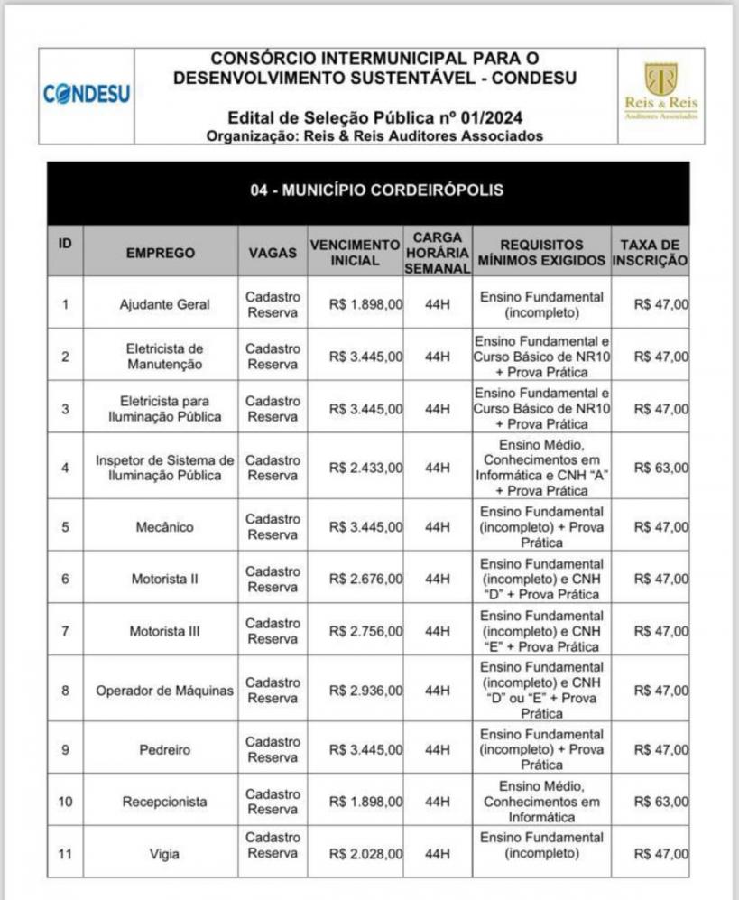 Cordeirópolis: Ajudante Geral; Eletricista de Manutenção; Eletricista para Iluminação Pública; Inspetor de Sistema de Iluminação Pública; Mecânico; Motorista II; Motorista III; Operador de Máquinas; Pedreiro; Recepcionista; Vigia;