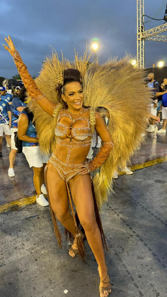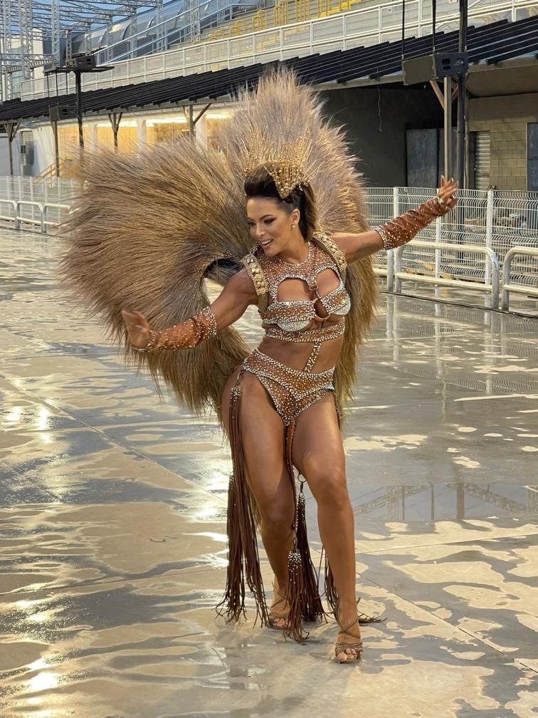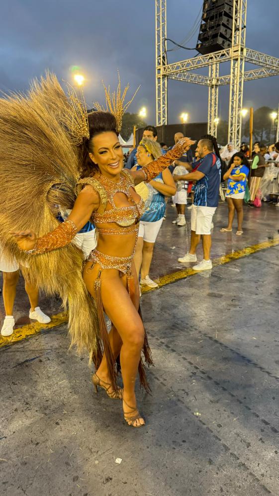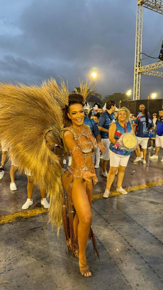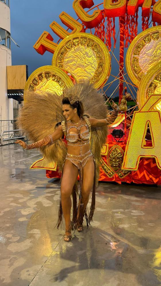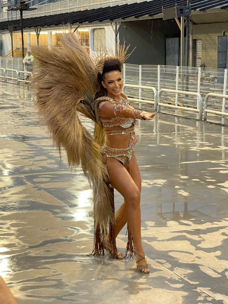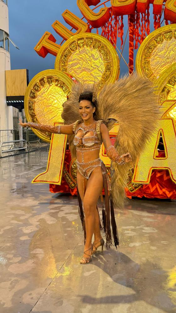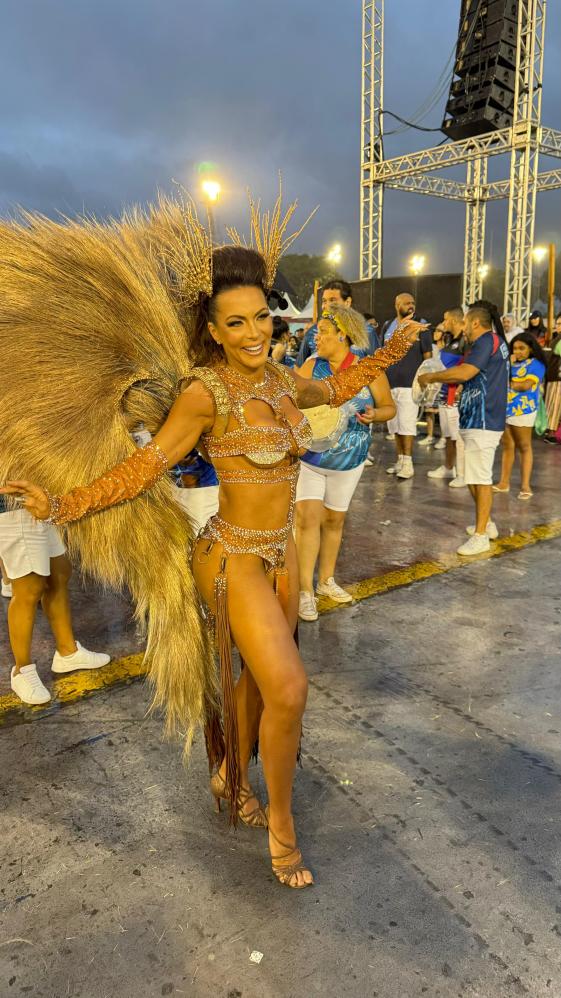 carnaval, a apresentadora Carla Prata pisou na avenida e mesmo em meio a chuva que caía na capital paulistana, mostrou muito samba no pé no ensaio técnico da Acadêmicos do Tucuruvi, onde é Rainha de Bateria, ocorrido na noite deste domingo, dia 21 de janeiro de 2024.