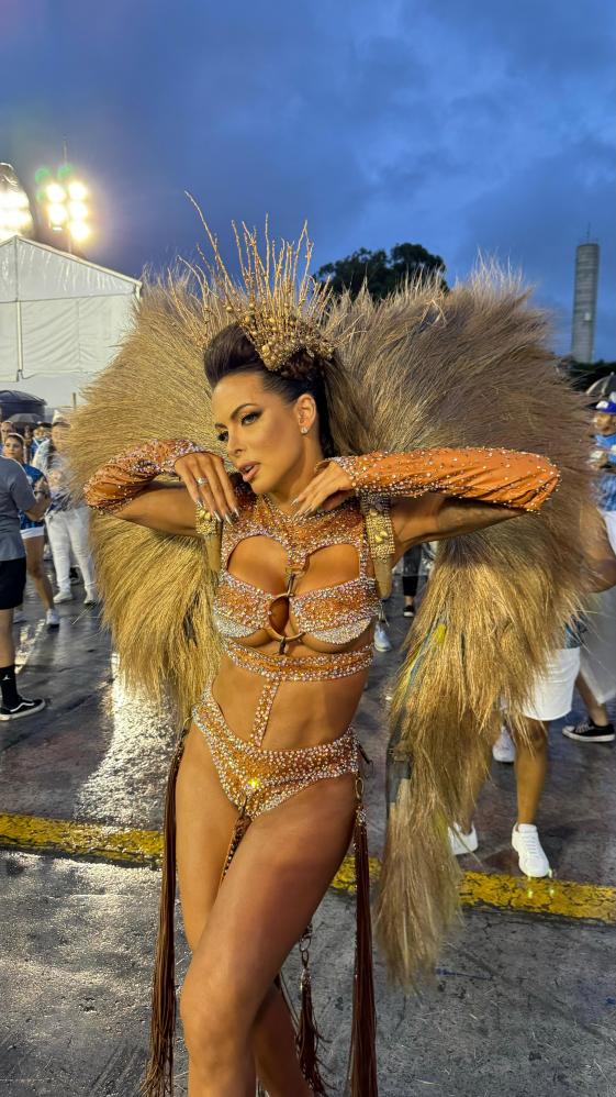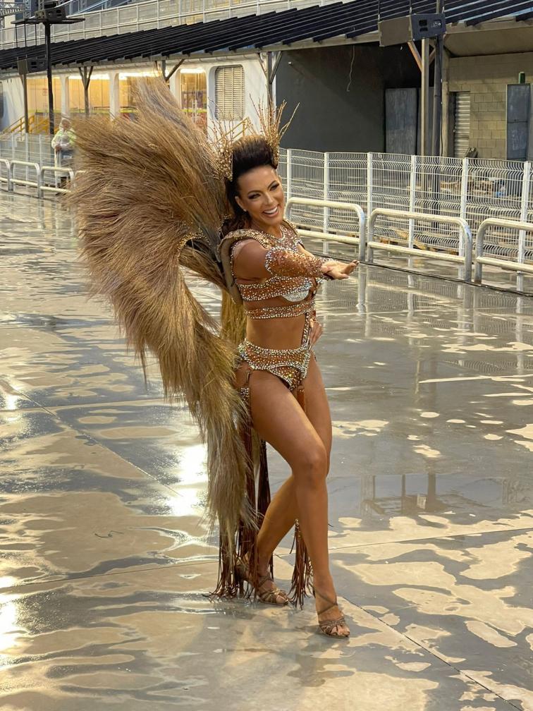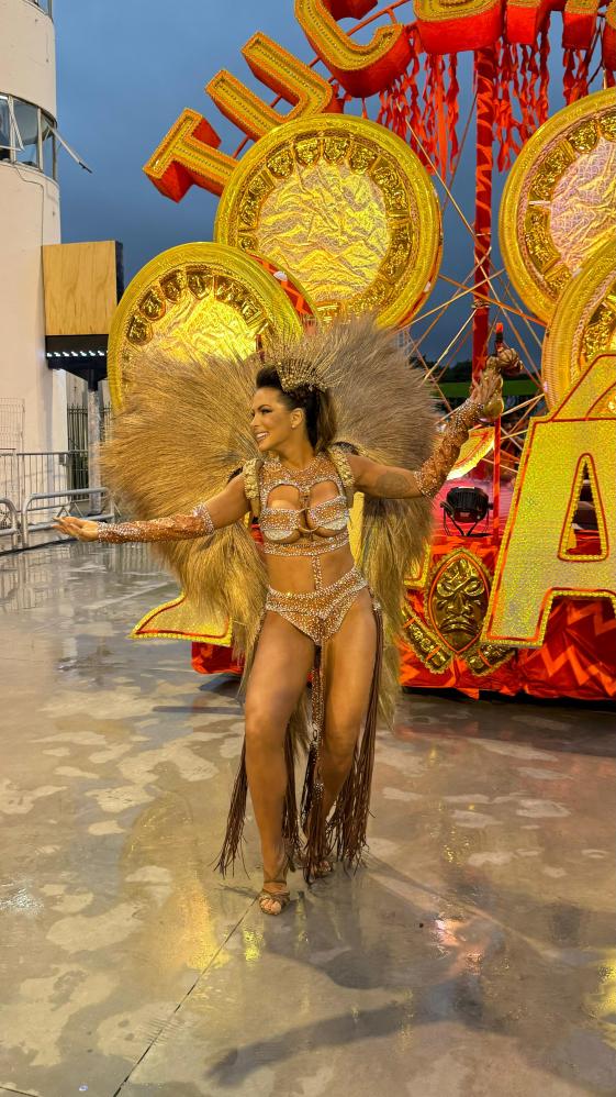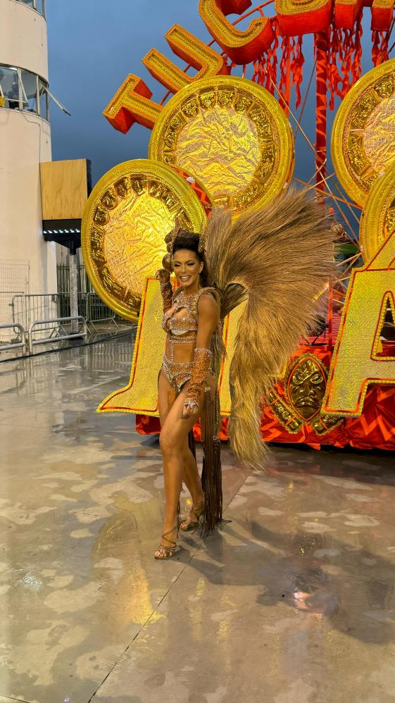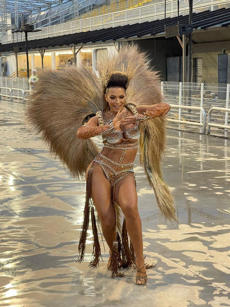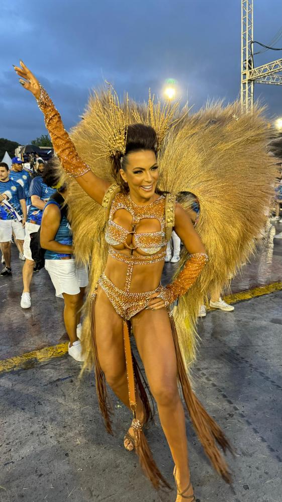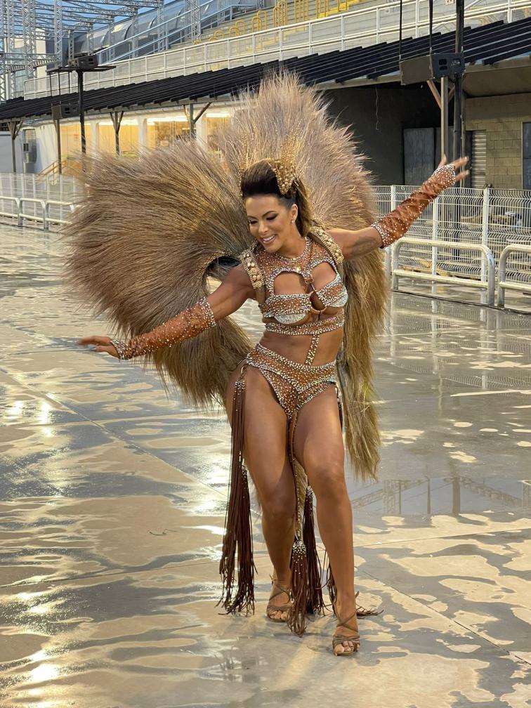 carnaval, a apresentadora Carla Prata pisou na avenida e mesmo em meio a chuva que caía na capital paulistana, mostrou muito samba no pé no ensaio técnico da Acadêmicos do Tucuruvi, onde é Rainha de Bateria, ocorrido na noite deste domingo, dia 21 de janeiro de 2024.