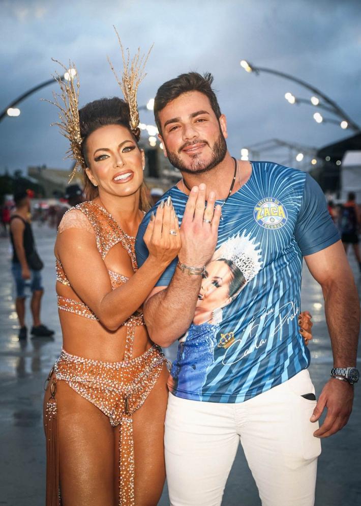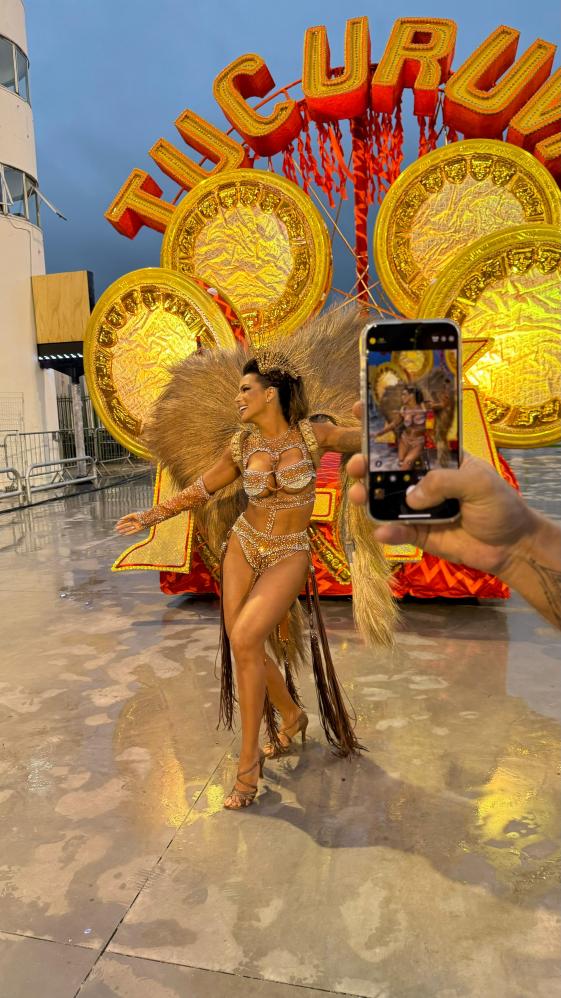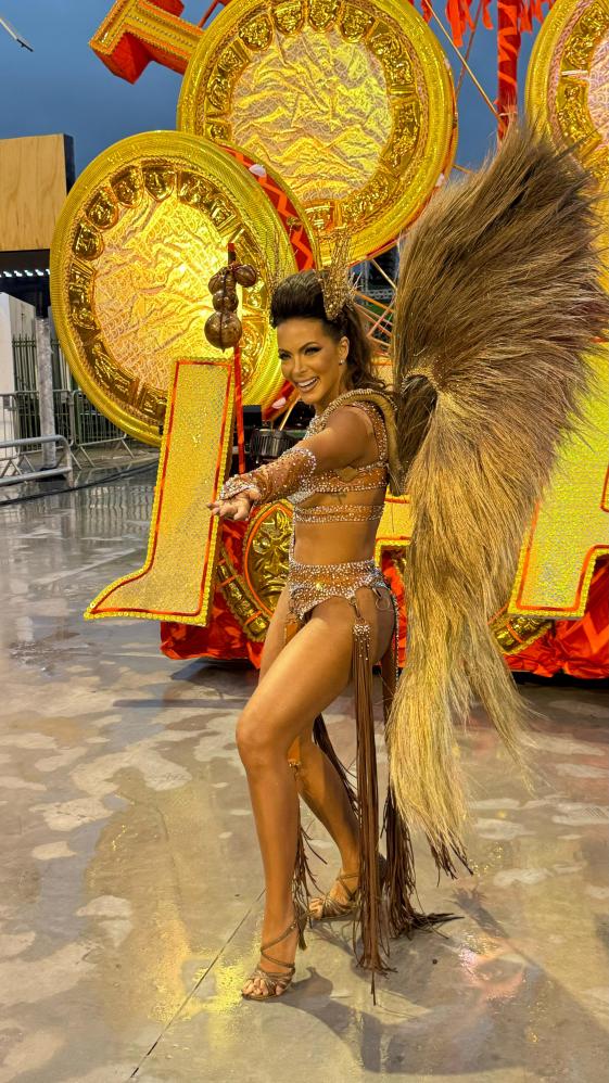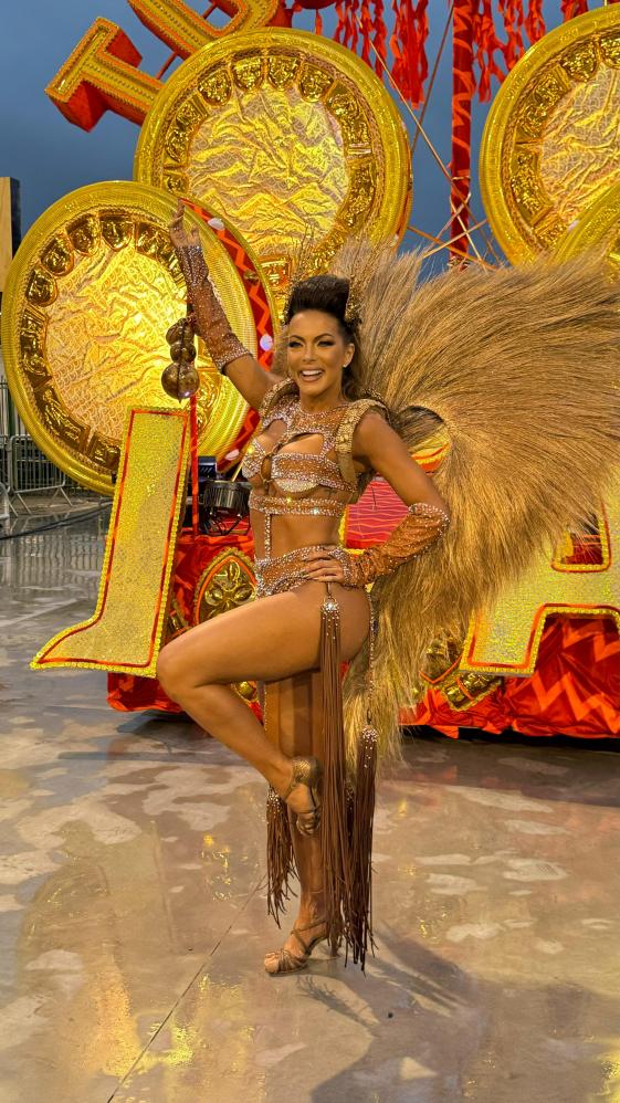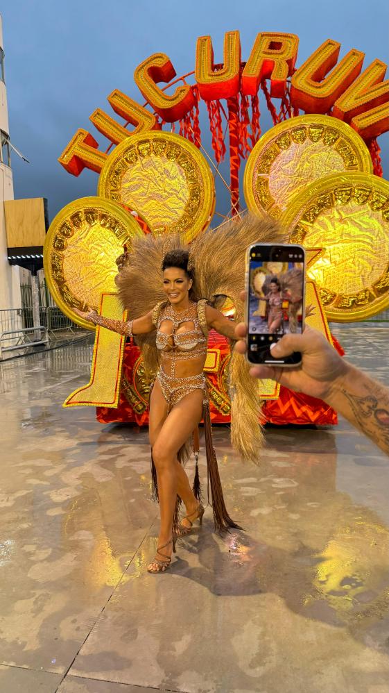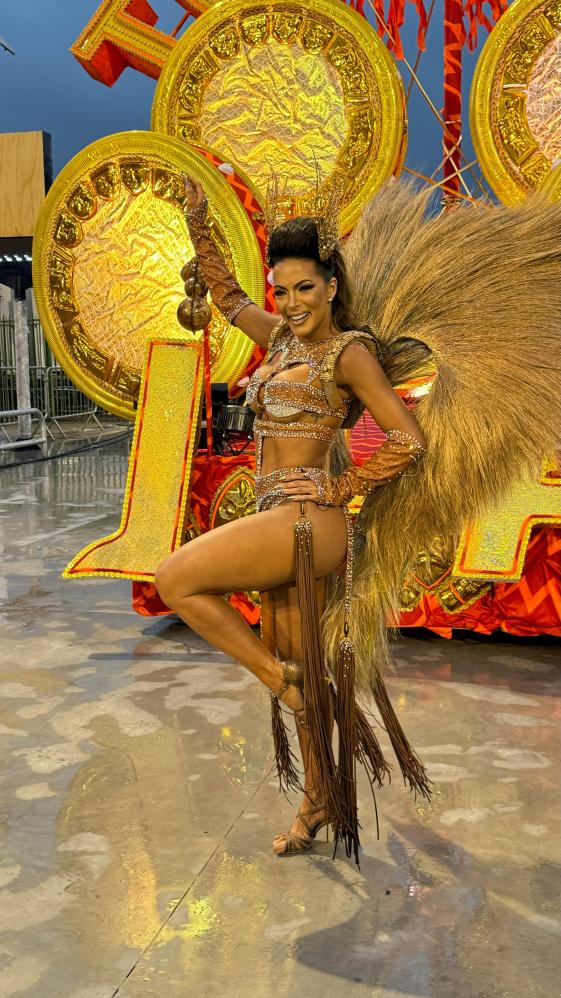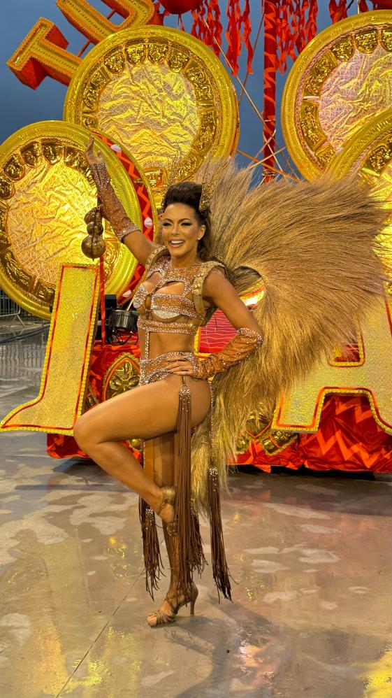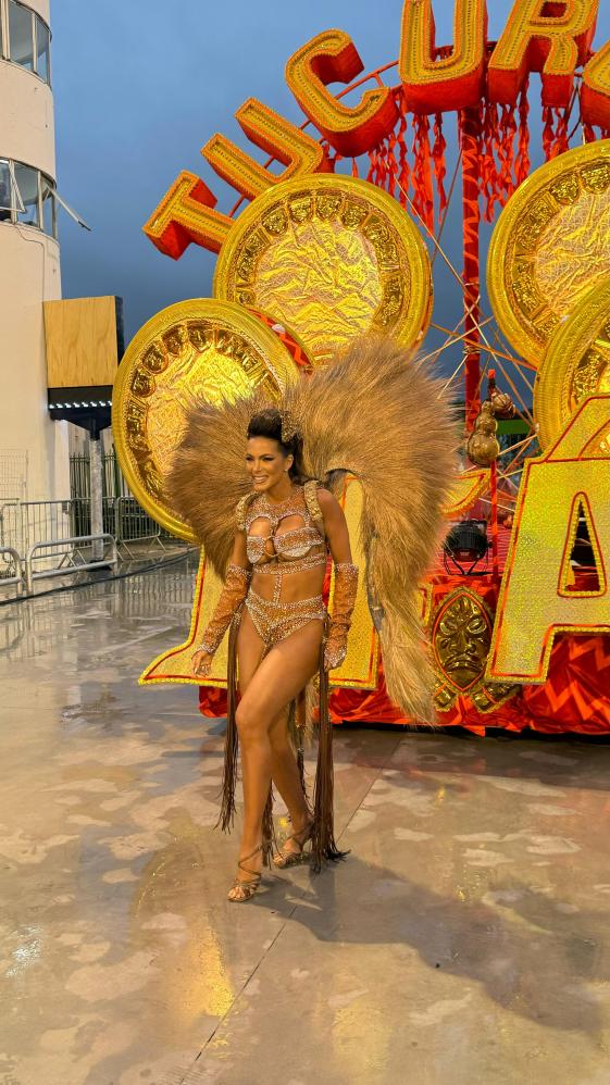 carnaval, a apresentadora Carla Prata pisou na avenida e mesmo em meio a chuva que caía na capital paulistana, mostrou muito samba no pé no ensaio técnico da Acadêmicos do Tucuruvi, onde é Rainha de Bateria, ocorrido na noite deste domingo, dia 21 de janeiro de 2024.