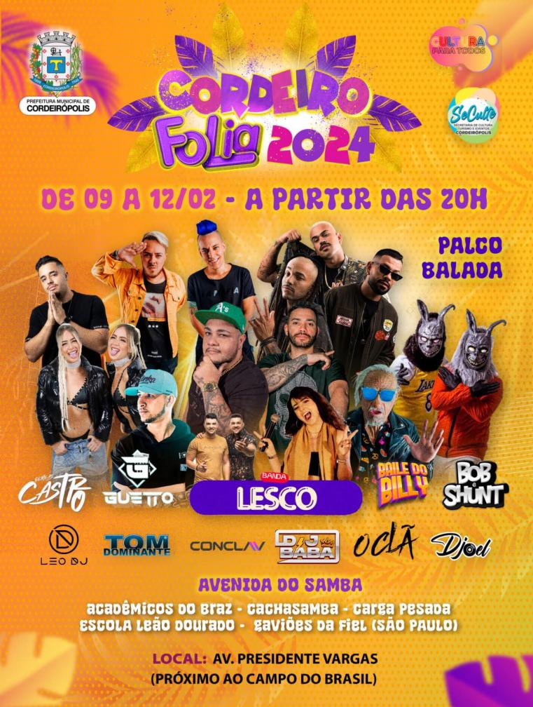 Cordeirópolis, por meio da Secretaria de Cultura, divulga a programação completa. O evento terá início na sexta-feira (09) até a segunda-feira (12) na Passarela do Samba localizada na Avenida Presidente Vargas, próxima ao Campo do Brasil. A terça-feira (13) de carnaval a festa será na Praça Central da cidade.