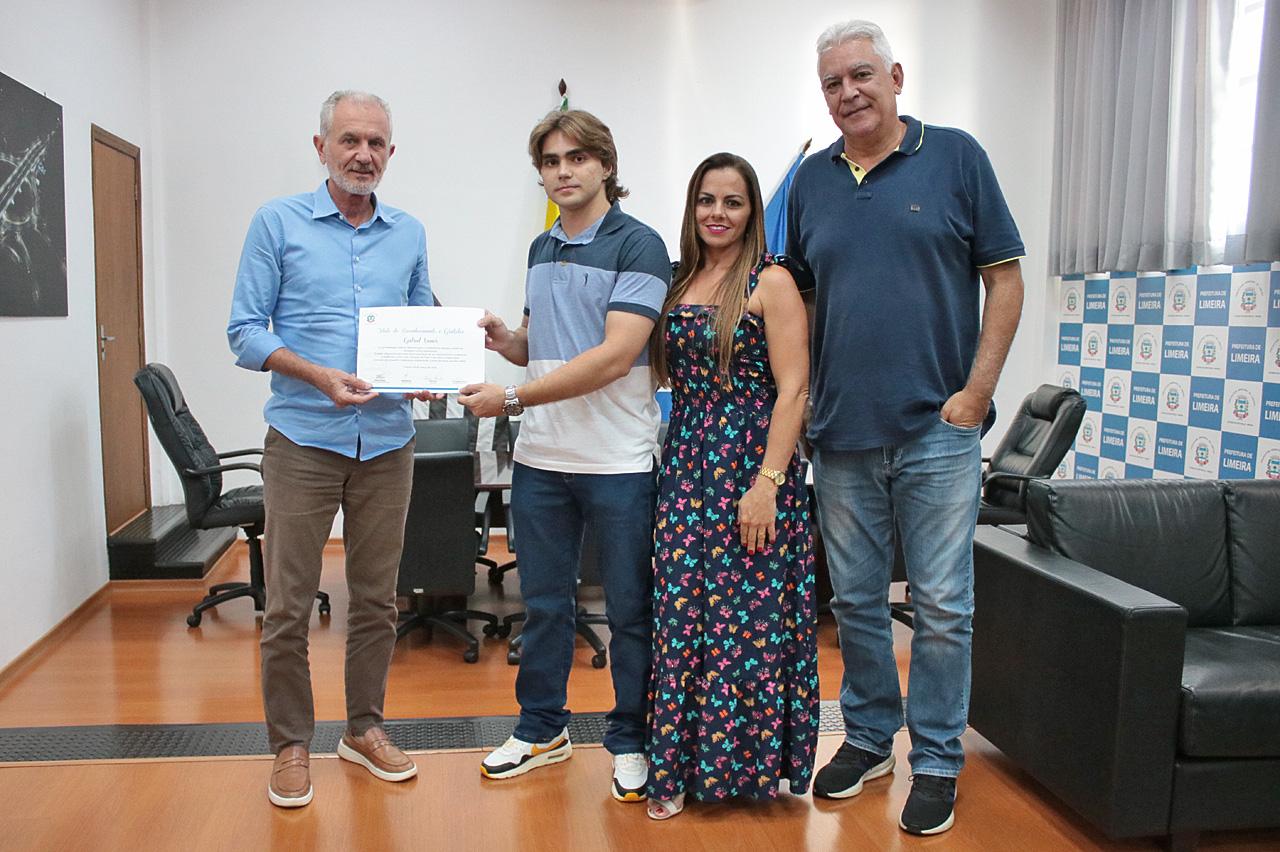 Limeira Mario Botion recebeu, na tarde desta última segunda-feira (4), o limeirense Gabriel Xavier, piloto profissional de kart. Aos 18 anos, ele já coleciona títulos no esporte. Na ocasião, ele recebeu um título de reconhecimento e gratidão pelos destaques no kart, em especial, representando Limeira. “Gabriel é um exemplo de empenho e dedicação, enaltecendo o nome da nossa cidade”, afirmou Botion.