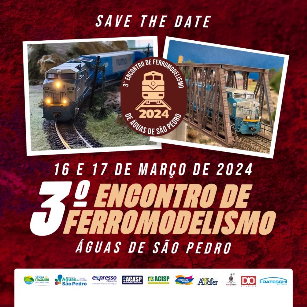 O 3º Encontro de Ferromodelismo de Águas de São Pedro acontecerá em 16 e 17 de março, no Centro de Convenções de Águas de São Pedro, na avenida Carlos Mauro, nº 90, terá entrada franca e reunirá amantes deste hobby de toda a região. No sábado, ele será das 9h às 18h, e no domingo, das 9h às 16h. O evento é organizado pela prefeitura da cidade, Secretaria de Turismo e ZTR Ferromodelismo, com apoio da Serra do Itaqueri, Gil Hobby Trains e da Frateschi, única fabricante da América Latina de trens elétricos em miniaturas e réplicas de composições reais, situada em Ribeirão Preto, no interior paulista.