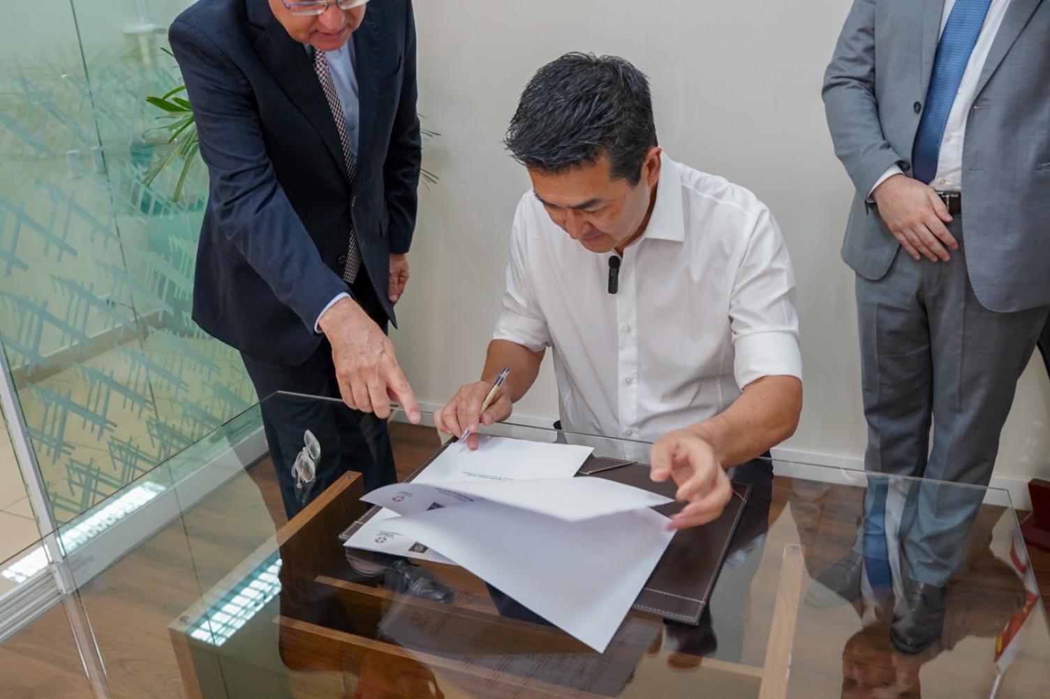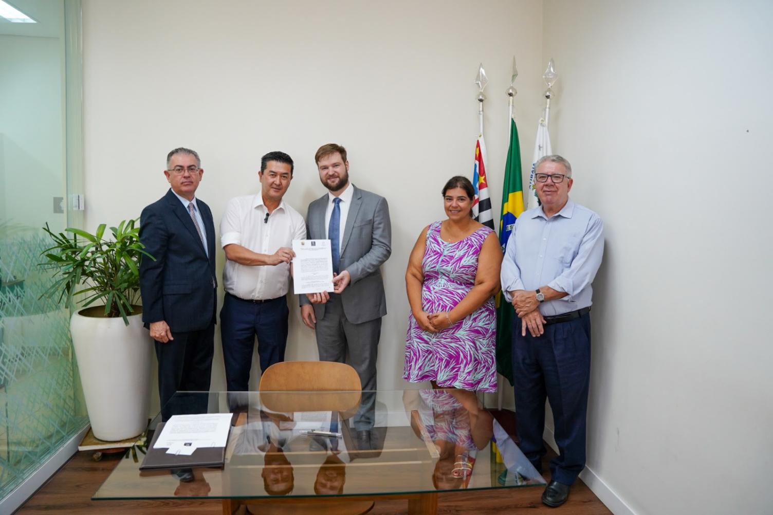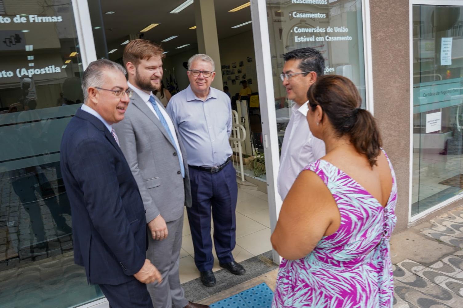 O juiz corregedor permanente Rogério Correia Dias e o oficial de Registro Civil das Pessoas Naturais, Marcelo Puccini, recepcionaram o prefeito Emil Ono no cartório para a cerimônia de assinatura do convênio para implantação e funcionamento da "Unidade Interligada" dentro da Santa Casa, que realiza cerca de 70 partos por mês.