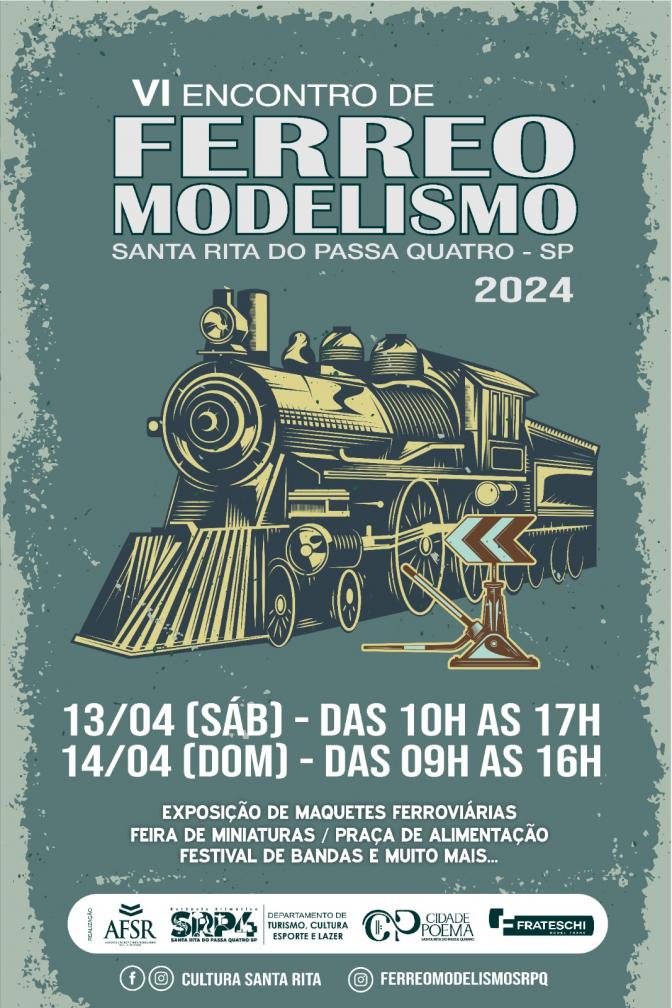 O 6º Encontro de Ferreomodelismo de Santa Rita do Passa Quatro acontecerá em 13 e 14 de abril, na estação ferroviária da cidade, localizada na praça Poeta Mário Mattoso, terá entrada franca e reunirá amantes deste hobby de várias cidades da região. No sábado, o horário será das 10h às 17h, e no domingo, das 9h às 16h. Na última edição, realizada no ano passado, cerca de seis mil pessoas compareceram ao local durante os dois dias de evento.