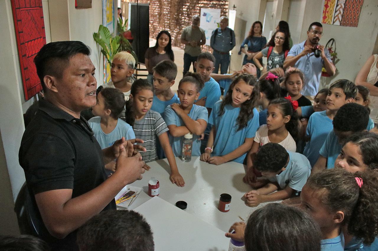 Na sequência, os alunos tiveram oportunidade de ver diferentes grafismos indígenas usados em pinturas corporais, cestarias e na cerâmica. E ainda, conheceram utensílios domésticos, como panelas de barro, cuias e cestos. No Cine Vagalume, eles assistiram a um filme sobre a cultura indígena e a uma apresentação de dança. “Vi bastante coisa interessante aqui, não conhecia o grafismo”, disse a aluna Maria Vitória Pinto, de 9 anos.