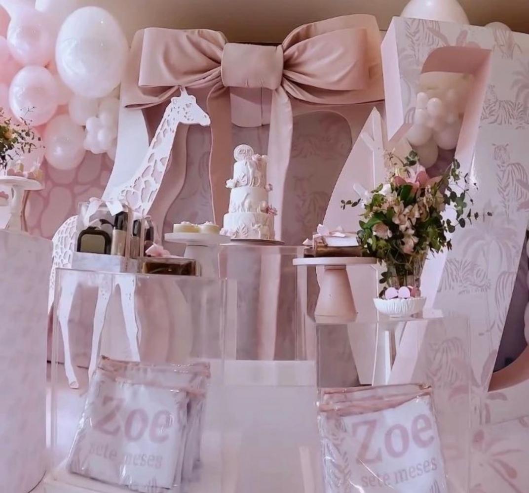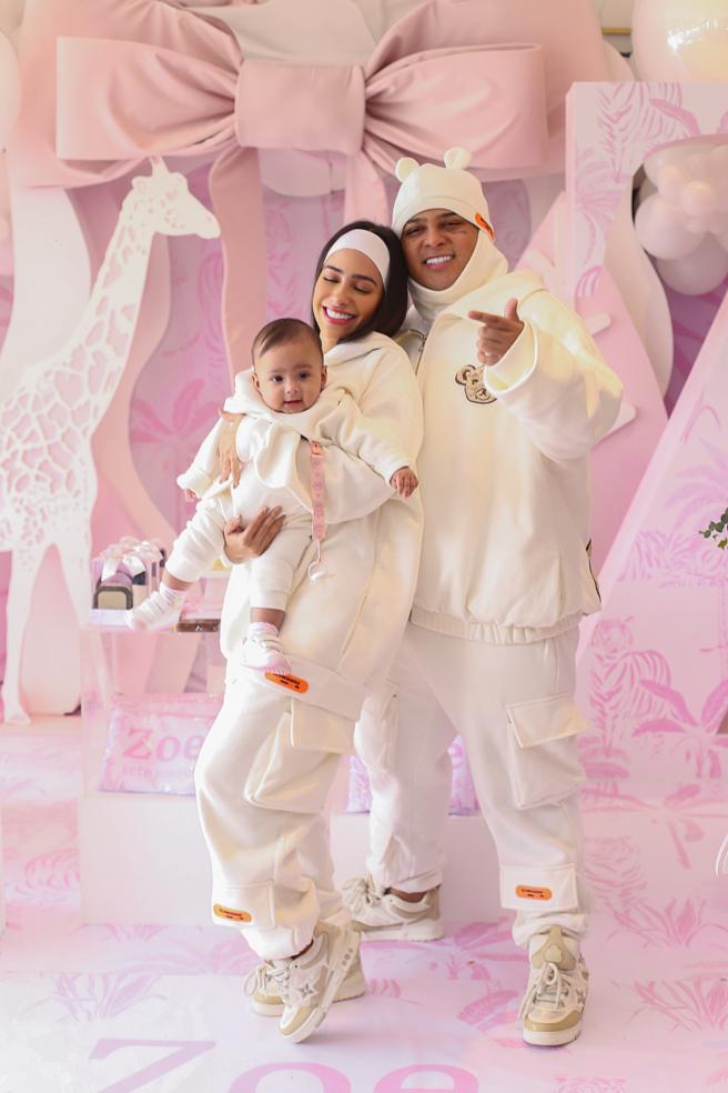Ao lado da esposa Giovanna Roque, a decoração escolhida para a ocasião foi com o tema Safari, tudo no tom rosa bebê, onde a família posou sorridente e felizes para as fotos.