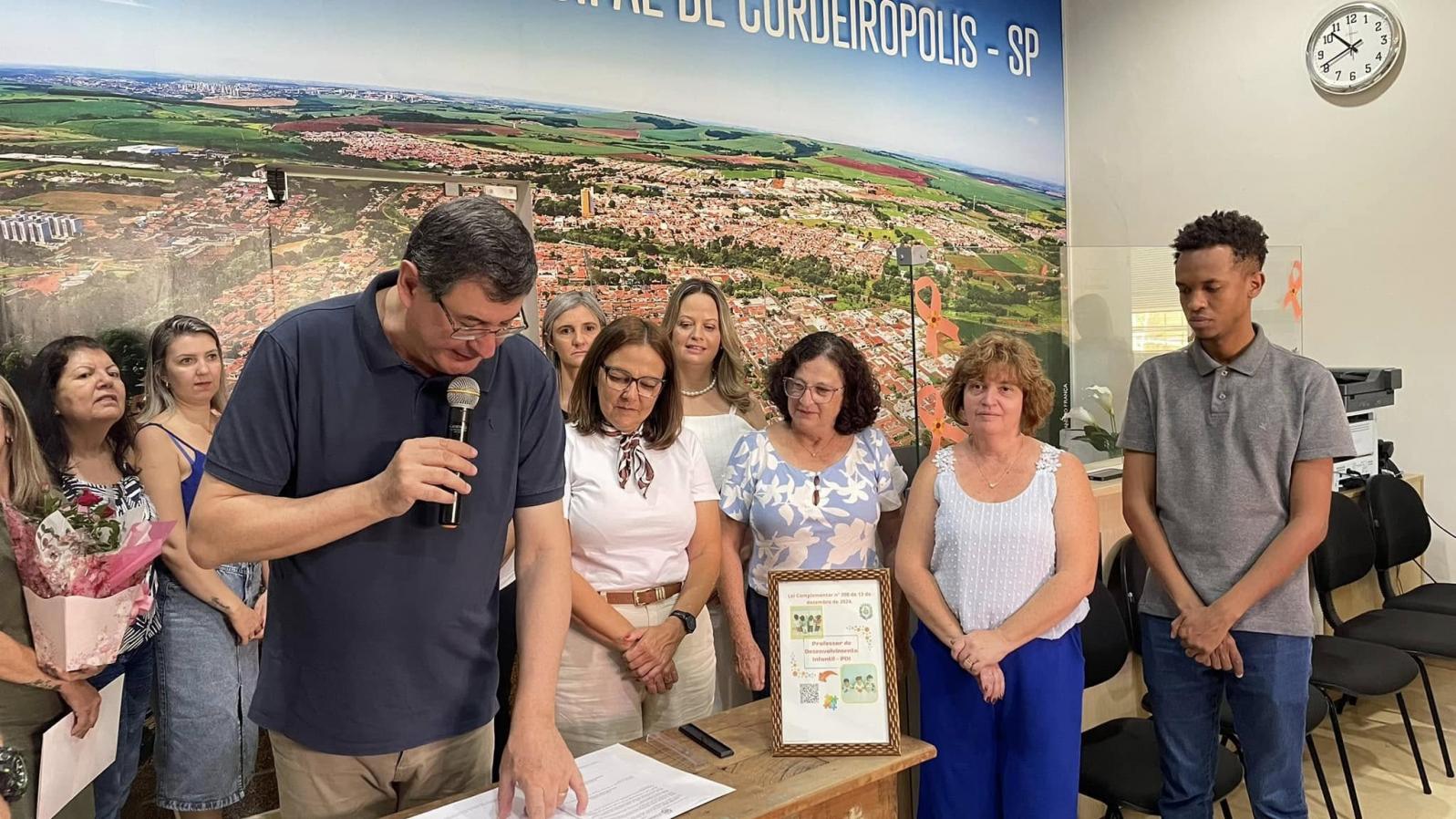 A cerimônia reuniu autoridades e gestores da Secretaria de Educação para esta sanção. Durante seu discurso, o prefeito Adinan Ortolan destacou que esta lei altera a nomenclatura do emprego público de Auxiliar de Desenvolvimento Infantil (ADI) para Professor de Desenvolvimento Infantil (PDI) e promove a inclusão desses profissionais no Quadro do Magistério Municipal como integrantes dos Profissionais da Educação. “Por fim, a partir de agora vocês já sao professores da rede municipal de ensino de Cordeirópolis, uma conquista que chegou através do esforço e merecimento de cada uma das 55 profissionais aqui presentes” disse o mandatário.